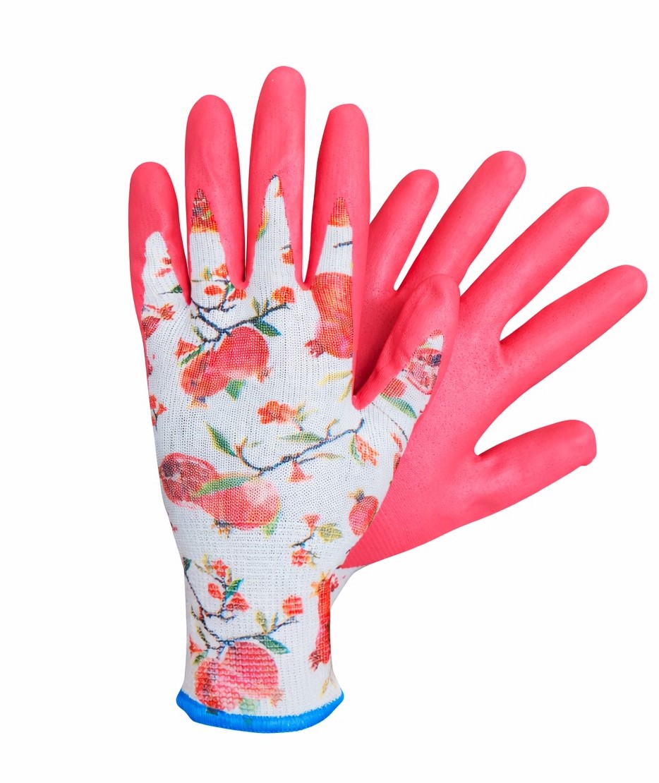 Nitrilu aplietos sodo pirštinės su granatų atvaizdu