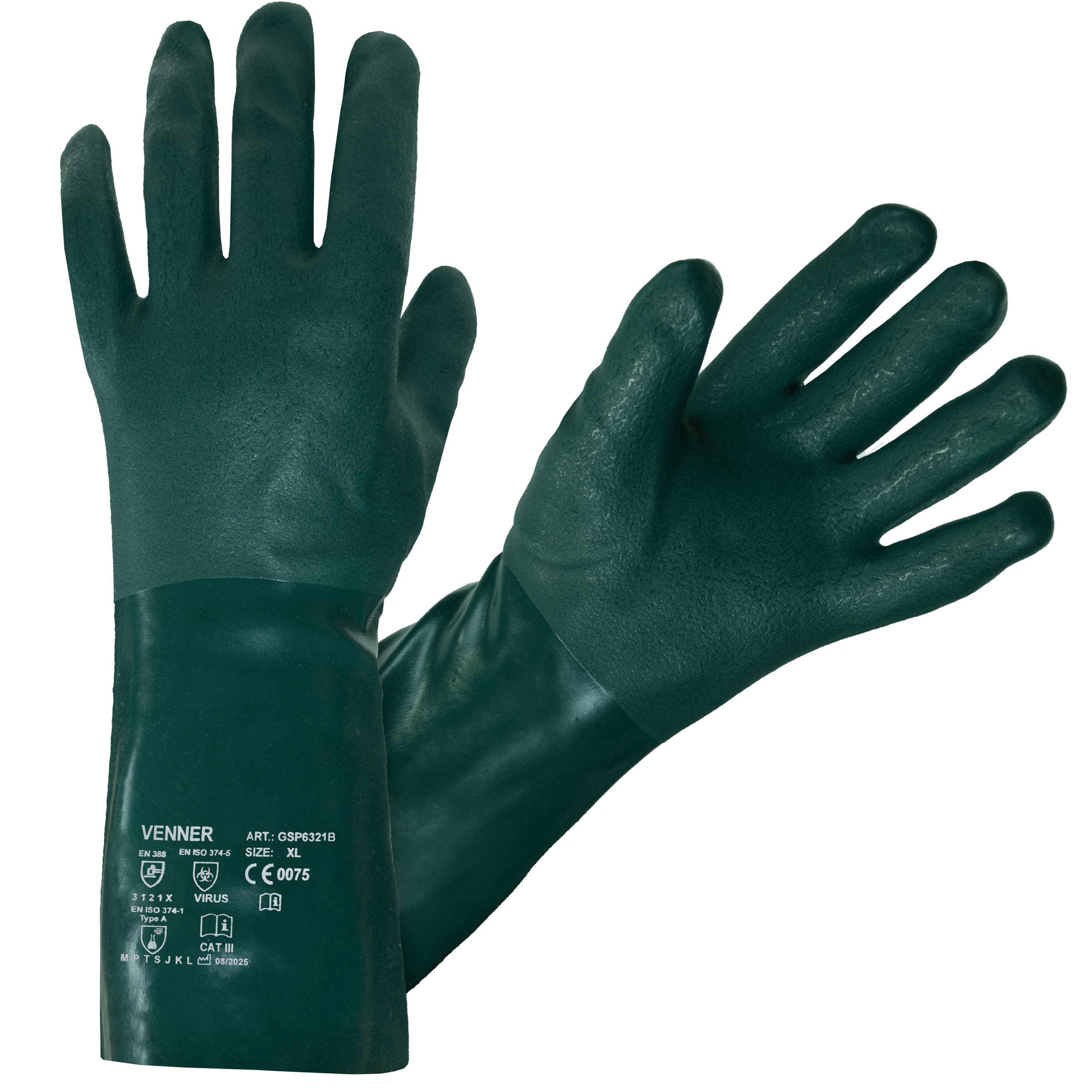 Patvarios PVC medžiagos – atsparios drėgmei ir chemikalams. 35 cm ilgis – apsaugo tiek rankas, tiek dilbius.