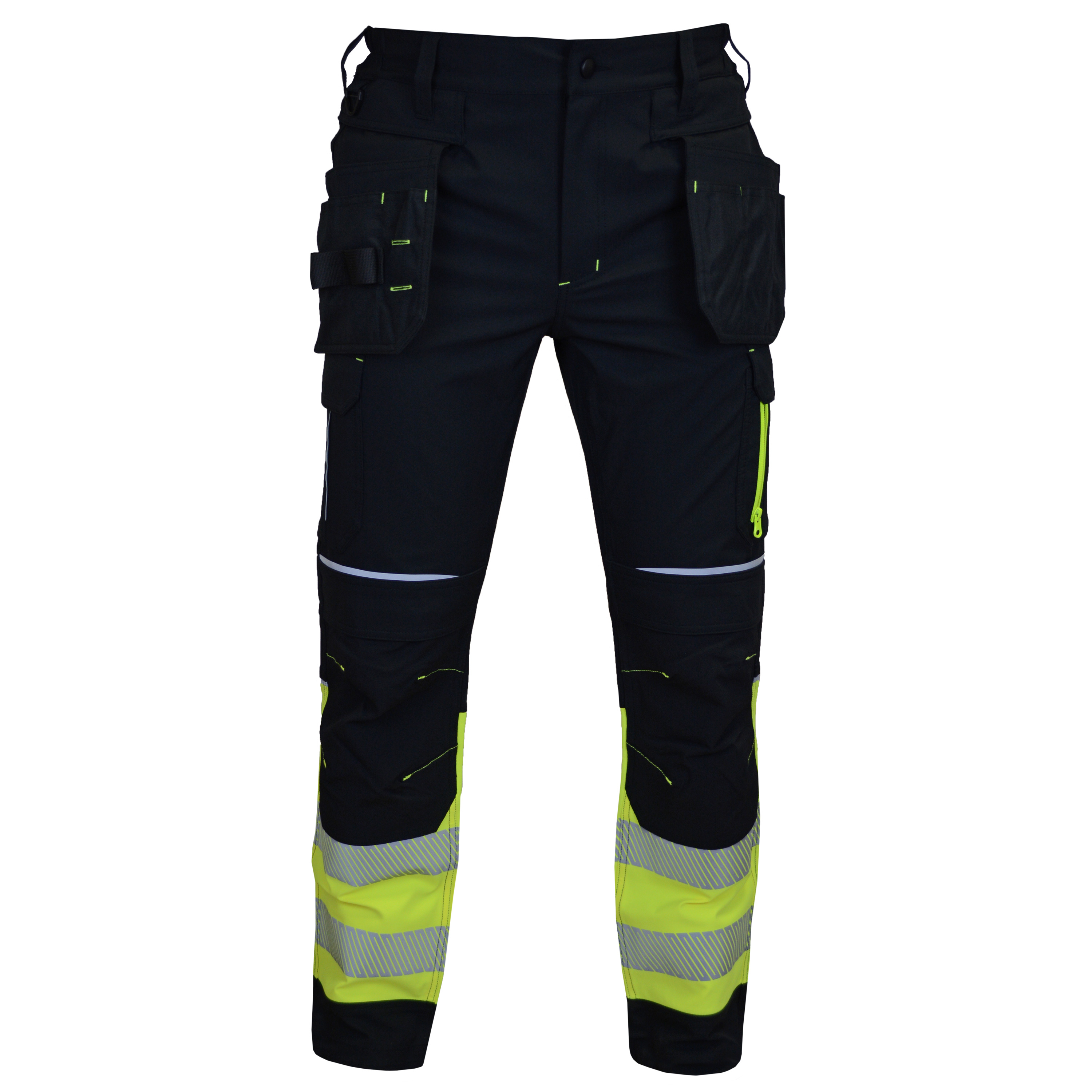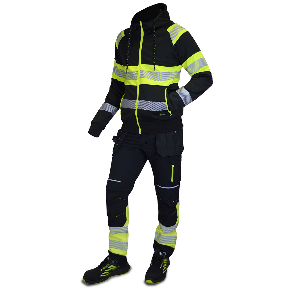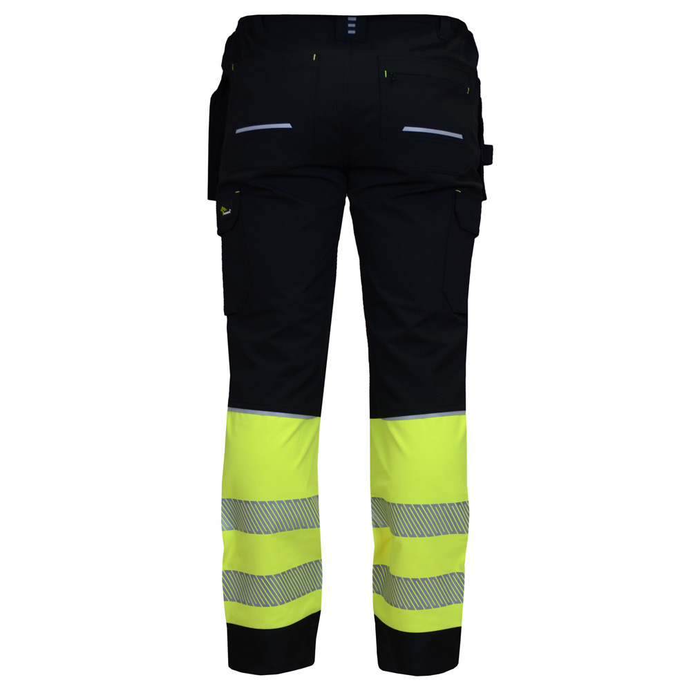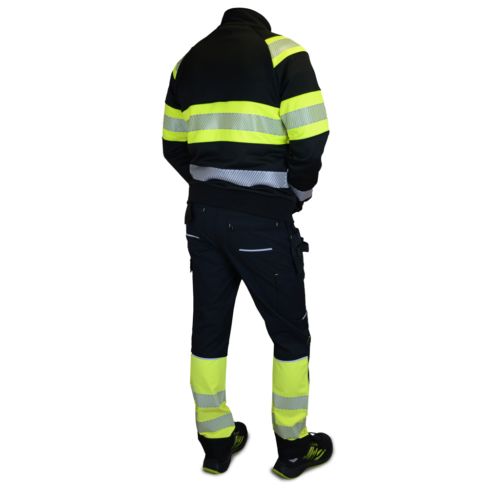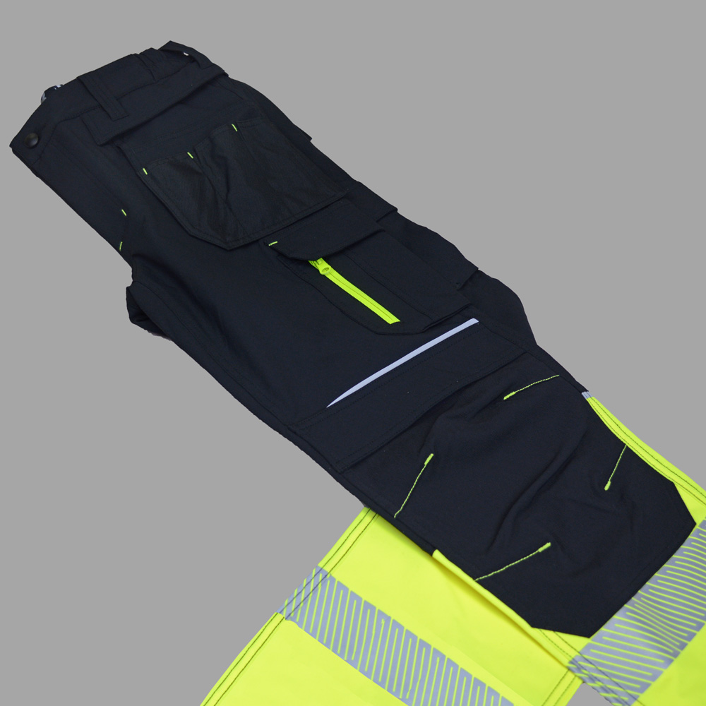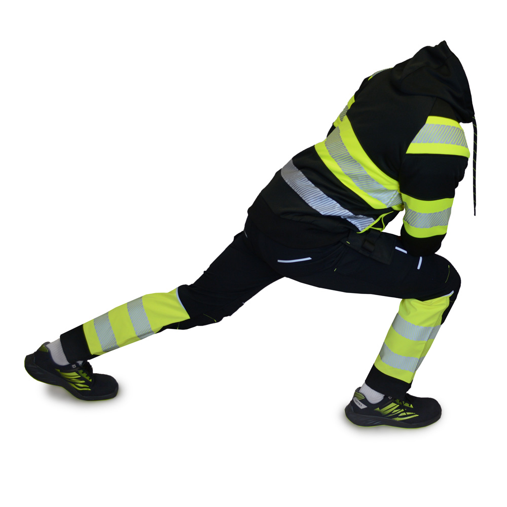 Juodos spalvos elastingos darbo kelnės Reflex, su signalinėmis juostomis, pagamintos iš inovatyvios Elastomultiester medžiagos, kuri pasižymi 4 krypčių tamprumu ir ilgalaikiu patvarumu. Šios darbinės kelnės sujungia matomumą, praktiškumą ir komfortą į vieną gaminį.